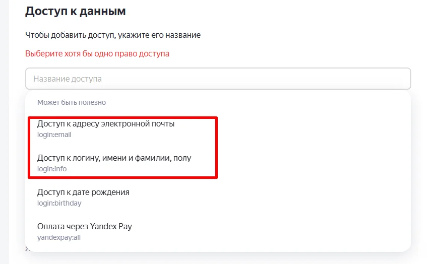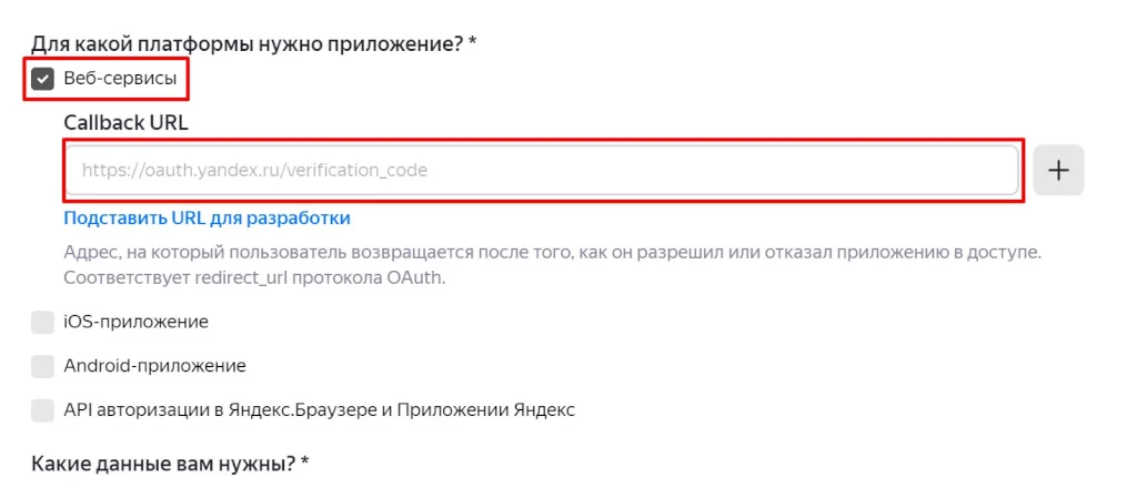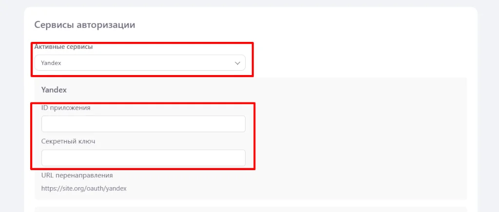 Перейдите в настройки вашего сайта и выберите раздел Профиль - Сервисы авторизации. Скопируйте ссылку URL перенаправления для Яндекса и укажите ее в callback url. Далее, в поле Доступ к данным выберите доступ к email и имени. Заполните остальные поля и создайте приложение.