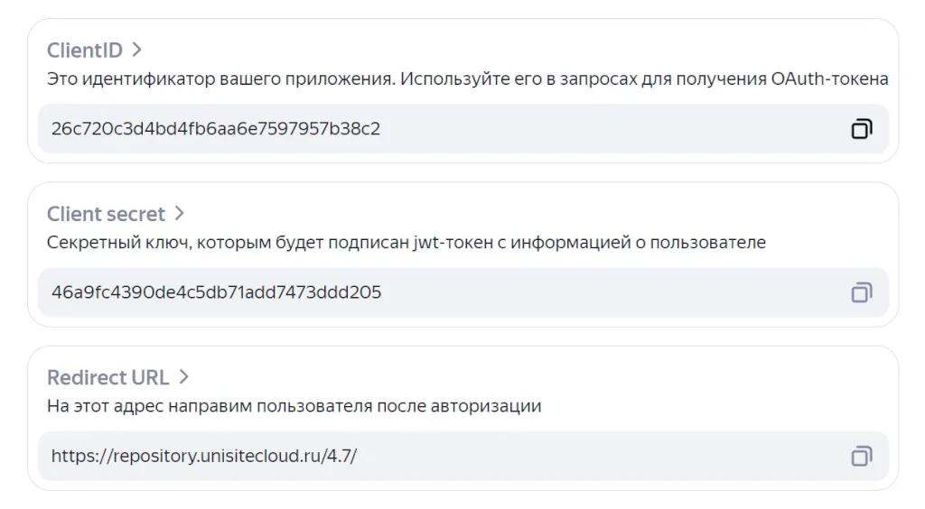 После создания приложения появятся данные авторизации, укажите их в настройках сайта в разделе Профиль - Сервисы авторизации. Сохраните настройки. Интеграция успешно завершена!