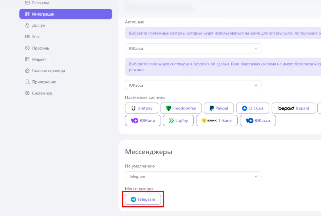 Перейдите в настройки сайта во вкладку интеграции и выберите мессенджер telegram.