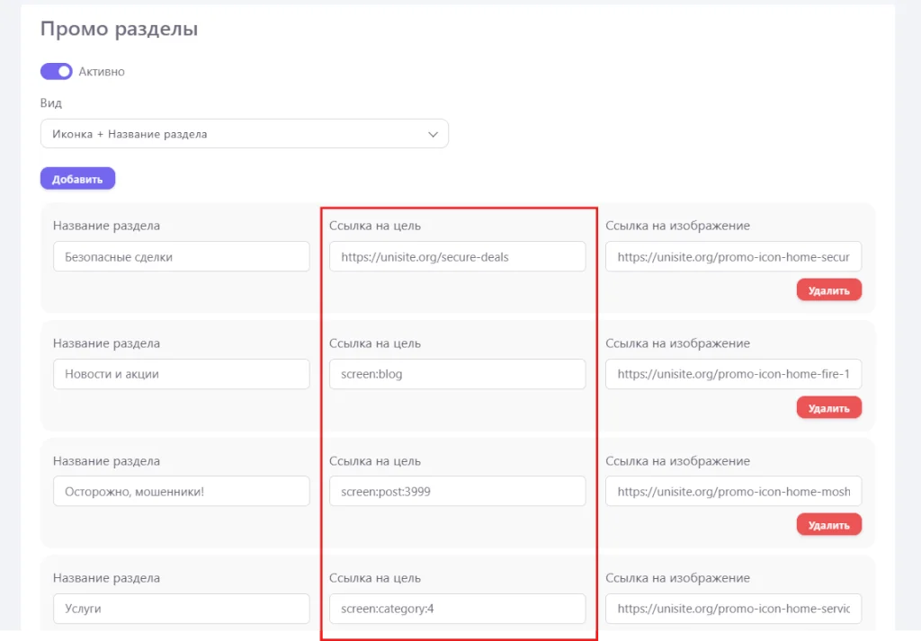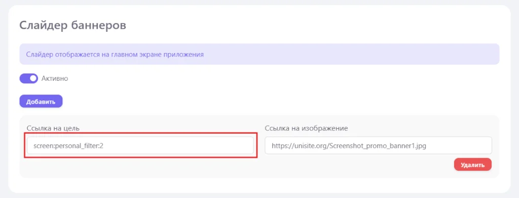 Макросы предоставляют возможность делать навигацию внутри мобильного приложения. Макрос вы можете указать внутри поля “Ссылка на цель” при добавлении баннера на главном экране или промо раздела.