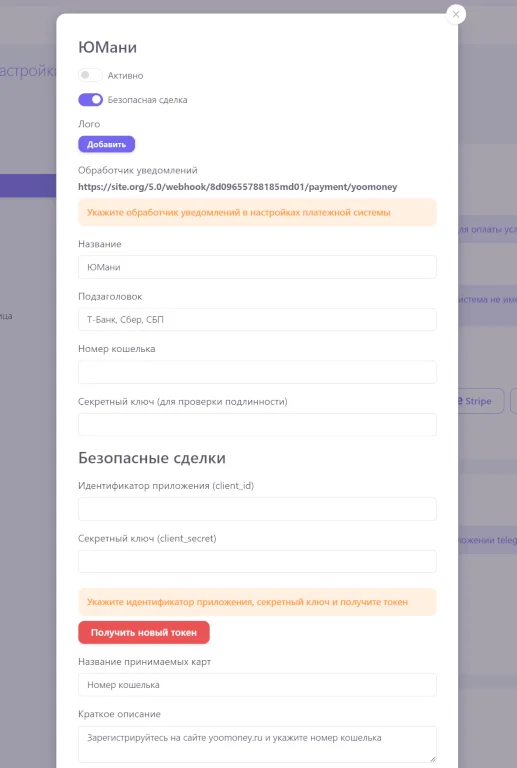Перейдите в настройки вашего сайта во вкладку Интеграции - Платежные системы, далее выберите YooMoney. Укажите ключи с вашего созданного приложения и сохраните настройки. После сохранения нажмите на кнопку “Получить токен”.