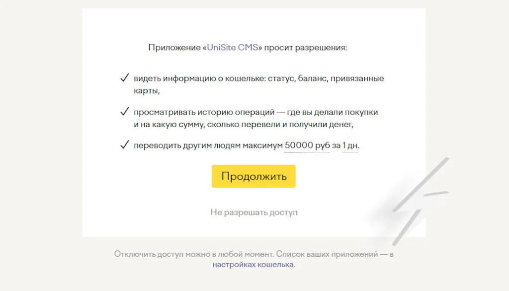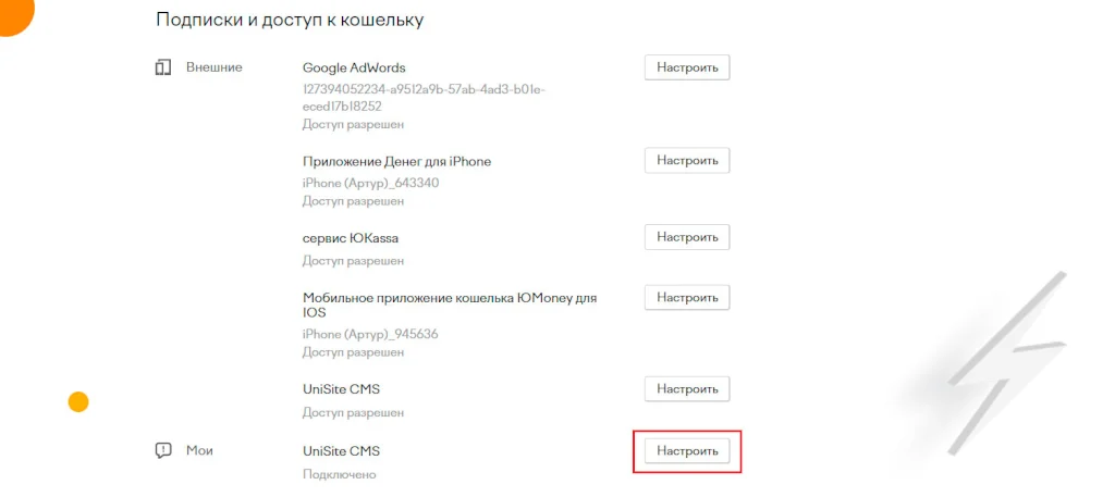Укажите необходимые данные и сохраните. Далее, перейдите в настройки платежной системы во вкладку Безопасность / Доступ к кошельку и выберите ваш созданный проект