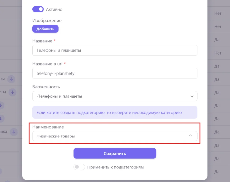 Перейдите в редактирование категории или после добавления категории перейдите во вкладку основное и выберите наименование товаров которые будут в категории, оформление заказов возможно только для физических товаров, электронных товаров и услуг.
